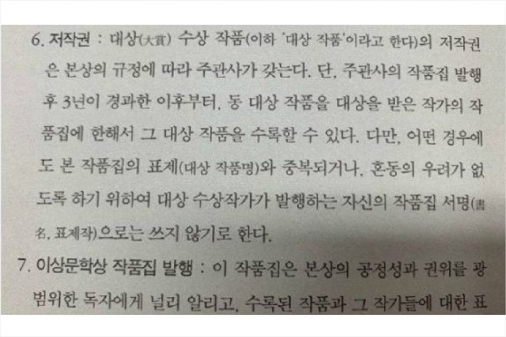 이상문학상의 경우 공모전도 아니고 이미 세상에 발표된 작품들 중에서 우수작을 선정하는 방식입니다. 공모전도 수상작의 저작권을 강제로 양도하는 일에 거부감이 있는데 하물며 이미 발표된 작품을 나중에 문학상 후보로 선정해 놓고 상을 받으려면 저작권을 3년간 양도하라는 요구는 매우 불공정한 일이라고 볼 수 있습니다.